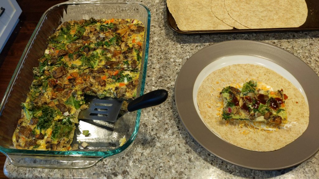 I’ve been making breakfast burritos for a while now. It’s very basic, just eggs, chopped veggies, some cheese, and some light mayo, and a few splashes of chipotle tabasco sauce.